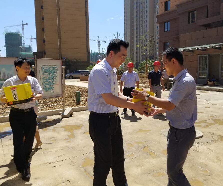 7月25日,建設集團董事長、黨委副書記周君、副總經理張鋼平一行冒著近四十度的高溫前往溧水天岳城項目為員工送去清涼和關愛。周君董事長代表集團黨委、工會為員工們贈送了防暑降溫藥品和飲料等清涼物品。慰問活動結束后,周董事長聽取了項目進展情況匯報 并強調,寧鎮區域當前的工作重點一是要圍繞集團下達的2017年經營指標,做好房屋交付、清盤等收尾工作;二是要持續強化安全生產意識,徹底排查安全隱患,狠抓安全生產責任落實,確保各項工作穩妥推進;三是各級領導干部和員工要有勇于擔當的精神,做到守土有責、守土盡責。